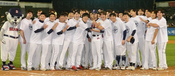 8일 서울 잠실야구장에서 ‘2022 신한은행 MY CAR KBO리그’ 키움 히어로즈와 두산 베어스 경기가 열렸다. 두산 오재원이 은퇴식에서 선수단과 기념 촬영을 하고 있다.