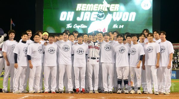8일 서울 잠실야구장에서 ‘2022 신한은행 MY CAR KBO리그’ 키움 히어로즈와 두산 베어스 경기가 열렸다. 두산 오재원이 은퇴식에서 선수단과 기념 촬영을 하고 있다.