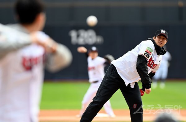 10일 경기도 수원 kt위즈파크에서 ‘2022 신한은행 SOL KBO리그’ kt 위즈와 NC 다이노스의 경기가 열렸다. 프로농구 컵대회 우승팀 kt 양홍석이 시구를 하윤기가 시타를 펼치고 있다.