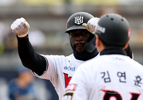 10일 경기도 수원 kt위즈파크에서 ‘2022 신한은행 SOL KBO리그’ kt 위즈와 NC 다이노스의 경기가 열렸다. 4회말 무사 2루에서 kt 알포드가 안타를 날린 후 환호하고 있다.