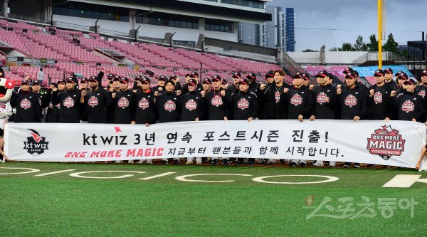 10일 경기도 수원 kt위즈파크에서 ‘2022 신한은행 SOL KBO리그’ kt 위즈와 NC 다이노스의 경기가 열렸다. kt가 NC를 상대로 5-2 승리한 후 이강철 감독 및 선수들이 포스트시즌 선전을 다짐하는 화이팅을 외치고 있다.
