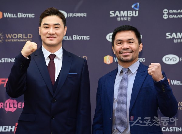 무술가 DK YOO와 정치인이자 복싱선수 매니 파퀴아오가 11일 서울 중구 프레스센터에서 열린 스페셜 매치 및 메타버스 아바타 행사 기자간담회에서 포즈를 취하고 있다.