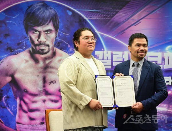 갤럭시코퍼레이션 최용호 대표와 정치인이자 복싱선수 매니 파퀴아오가 11일 서울 중구 프레스센터에서 열린 스페셜 매치 및 메타버스 아바타 행사 기자간담회에서 협약식을 맺어 포즈를 취하고 있다.