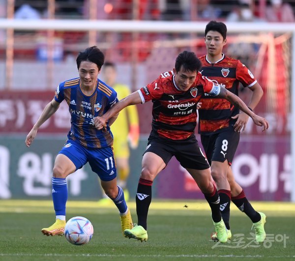 11일 포항스틸야드에서 열린 프로축구 ‘하나원큐 K리그1 2022’ 포항스틸러스와 울산현대 경기에서 울산 엄원상이 포항의 수비를 뚫고 공격하고 있다.