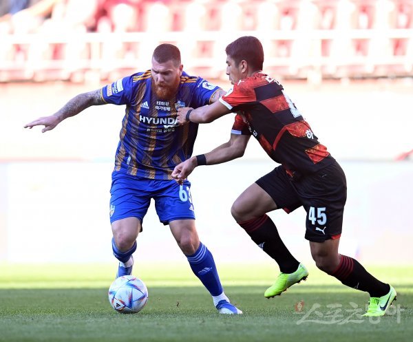 11일 포항스틸야드에서 열린 프로축구 ‘하나원큐 K리그1 2022’ 포항스틸러스와 울산현대 경기에서 울산 마틴 아담이 포항의 수비를 뚫고 공격하고 있다.