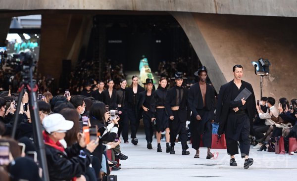 11일 서울 중구 동대문디자인플라자에서 열린 ‘2023 S/S 서울패션위크’ 개막쇼에서 차승원을 비롯한 모델들이 런웨이를 걷고 있다.