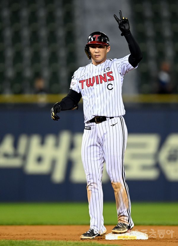 11일 서울 잠실야구장에서 ‘2022 신한은행 SOL KBO리그’ LG 트윈스와 kt 위즈의 경기가 열렸다. 3회말 2사에서 LG 오지환이 2루타를 날린 후 환호하고 있다.