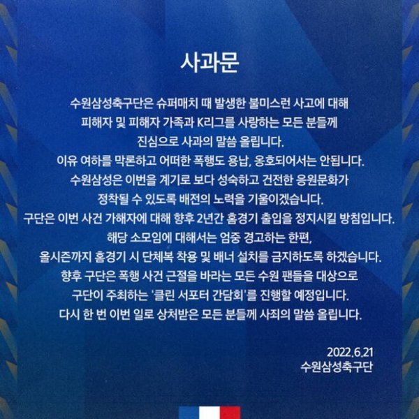 6월 수원 삼성-FC서울의 ‘슈퍼매치’에서 발생한 팬 폭행사건 관련 경찰 수사가 마무리됐다. 수원중부경찰서는 공동상해 혐의로 수원 서포터스인 프렌테 트리콜로 소속 10대 A군 등 3명을 검찰에 송치했다고 11일 밝혔다. A군은 6월 19일 수원월드컵경기장에서 열린 수원-서울전에 앞서 경기장 밖에서 서울 팬인 중학생 B군을 들어올린 뒤 바닥에 내팽개치는 등 폭행을 가해 다치게 한 혐의를 받고 있다. 한국프로축구연맹은 경찰 수사와 별개로 A군에게 K리그 전체 경기장에 대한 영구 입장금지 징계를 내리고, 그가 소속된 응원 소모임을 해산하도록 한 바 있다.
