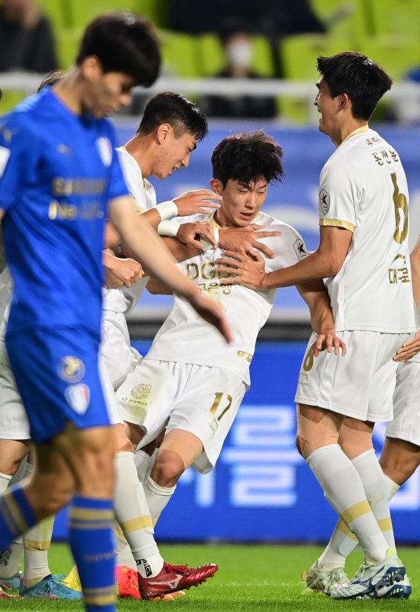12일 경기도 수원월드컵경기장에서 열린 ‘하나원큐 K리그1 2022’ 수원 삼성과 대구 FC의 경기에서 대구 고재현이 선제골을 성공시킨 후 정태욱의 장난에 넘어지고 있다.