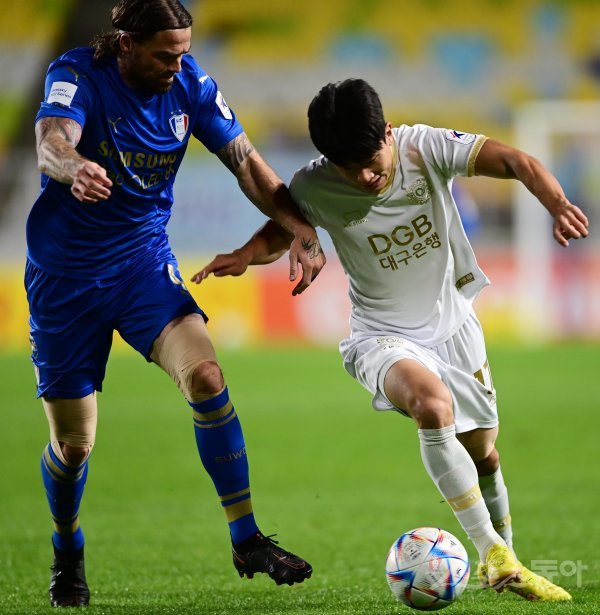 12일 경기도 수원월드컵경기장에서 열린 ‘하나원큐 K리그1 2022’ 수원 삼성과 대구 FC의 경기에서 대구 고재현이 수원 불투이스의 수비를 뚫고 드리블 돌파하고 있다.