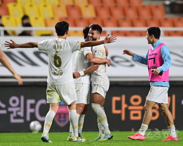 12일 경기도 수원월드컵경기장에서 열린 ‘하나원큐 K리그1 2022’ 수원 삼성과 대구 FC의 경기에서 2-1로 승리한 대구 선수들이 기쁨을 나누고 있다.