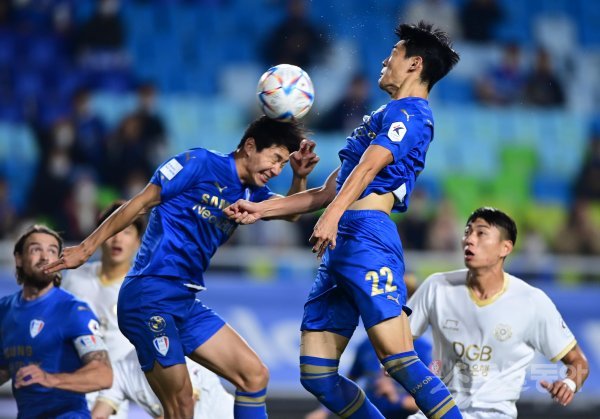 12일 경기도 수원월드컵경기장에서 열린 ‘하나원큐 K리그1 2022’ 수원 삼성과 대구 FC의 경기에서 수원 전진우와 안병준이 헤딩을 하고 있다.