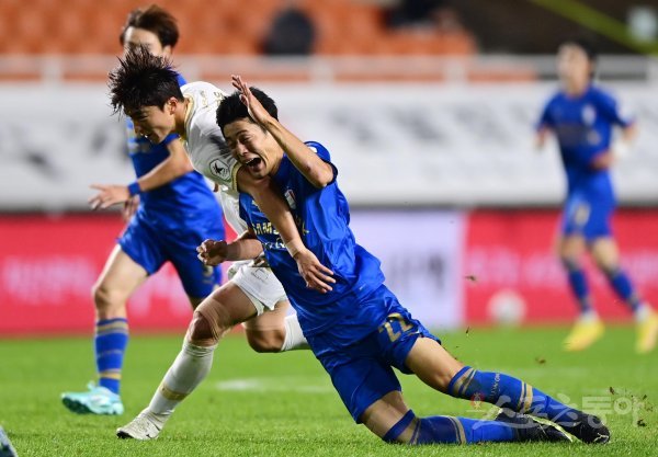 12일 경기도 수원월드컵경기장에서 열린 ‘하나원큐 K리그1 2022’ 수원 삼성과 대구 FC의 경기에서 수원 안병준이 몸싸움에 밀려 넘어지고 있다.