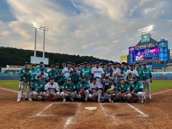 독립야구단 파주 챌린저스 선수들과 ‘최강야구‘ 최강 몬스터즈 선수들이 대구 삼성라이온즈파크에서 경기를 마친 뒤 사진촬영을 함께하는 모습. 사진제공 | 파주 챌린저스