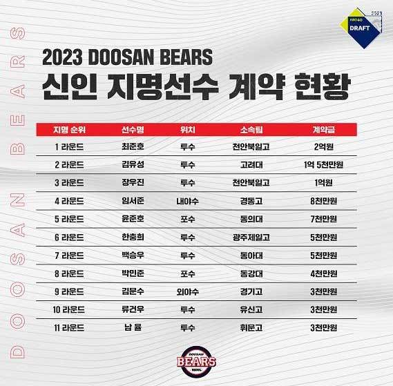 두산 베어스는 13일 “2023시즌 KBO 신인드래프트에서 지명한 신인 선수 11명 전원과 계약했다”고 밝혔다.