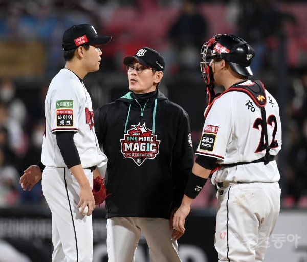13일 수원KT위즈파크에서 ‘2022 신한은행 MY CAR KBO리그’ 와일드카드 결정 1차전 KIA 타이거즈와 KT 위즈 경기가 열렸다. 6회초 1사 2루 상황에서 KT 이강철 감독이 선발 투수 소형준을 교체하고 있다.