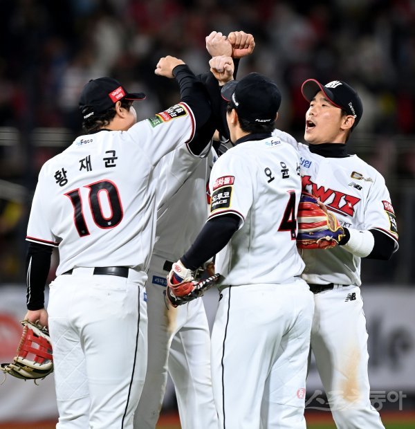 13일 경기도 수원 kt위즈파크에서 ‘2022 신한은행 SOL KBO리그’ kt 위즈와 KIA 타이거즈의 와일드카드 결정전 경기가 열렸다. kt가 KIA를 상대로 6-2로 승리한 후 선수들이 그라운드에서 기쁨을 나누고 있다. 수원 | 김민성 기자 marineboy@donga.com