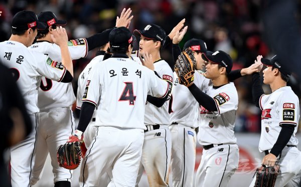 13일 경기도 수원 kt위즈파크에서 ‘2022 신한은행 SOL KBO리그’ kt 위즈와 KIA 타이거즈의 와일드카드 결정전 경기가 열렸다. kt가 KIA를 상대로 6-2로 승리한 후 선수들이 그라운드에서 기쁨을 나누고 있다.