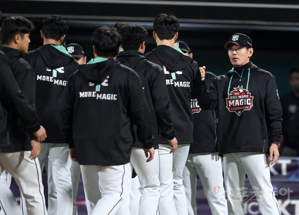 13일 수원KT위즈파크에서 ‘2022 신한은행 MY CAR KBO리그’ 와일드카드 결정 1차전 KIA 타이거즈와 KT 위즈 경기가 열렸다. 6-2 승리를 거둔 후 KT 이강철 감독이 선수들과 하이파이브 하고 있다.
