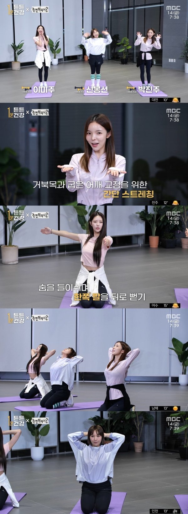 14일 오전 방송된 MBC ‘뉴스투데이’ 속 ‘1분 튼튼건강’ 코너에서 ‘놀면 뭐하니?’ 신봉선, 박진주, 이미주가 깜짝 등장해 또 한번 아침을 상쾌하게 열었다. 지난 13일 에어로빅을 하며 등장했던 유재석, 정준하, 하하, 이이경, 조혜련과는 180도 다른 차분한 분위기 속 요가 동작을 선보여 눈길을 끌었다.