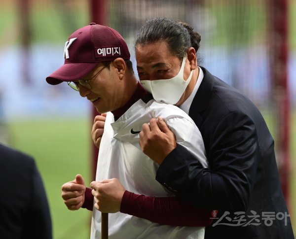 16일 서울 고척스카이돔에서 열린 ‘2022 신한은행 SOL KBO리그’ 준 플레이오프 1차전 키움 히어로즈와 KT 위즈의 경기에 앞서 키움 김일경 코치와 이상훈 해설위원이 인사하고 있다.