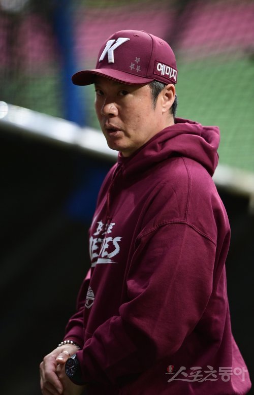 16일 서울 고척스카이돔에서 열린 ‘2022 신한은행 SOL KBO리그’ 준 플레이오프 1차전 키움 히어로즈와 KT 위즈의 경기에 앞서 키움 강병식 코치가 선수들의 훈련을 지켜보고 있다. 고척 | 주현희 기자 teth1147@donga.com