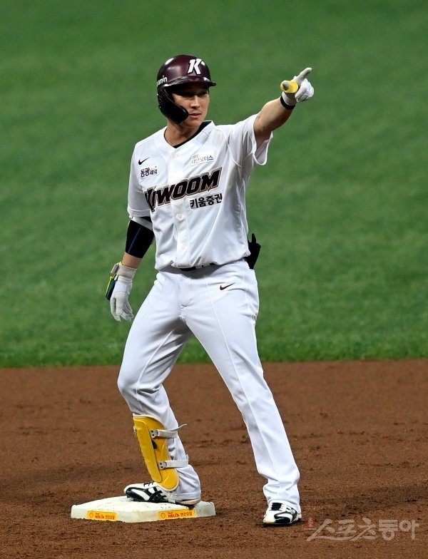16일 서울 고척스카이돔에서 ‘2022 신한은행 SOL KBO리그’ 키움 히어로즈와 kt 위즈의 준PO 1차전 경기가 열렸다. 1회말 무사에서 키움 김준완이 2루타를 날린 후 환호하고 있다.