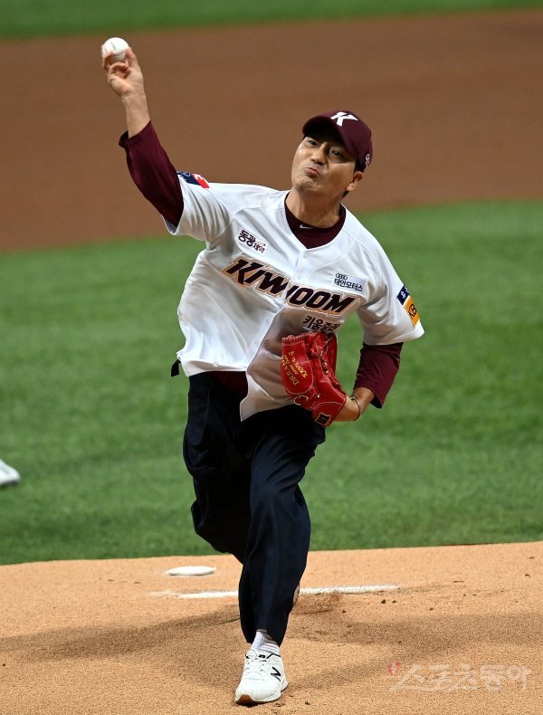 16일 서울 고척스카이돔에서 ‘2022 신한은행 SOL KBO리그’ 키움 히어로즈와 kt 위즈의 준PO 1차전 경기가 열렸다. ‘스토브리그’ 강두기 역의 배우 하도권이 시구를 던지고 있다.