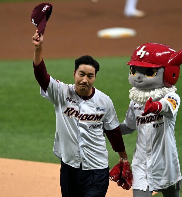 16일 서울 고척스카이돔에서 ‘2022 신한은행 SOL KBO리그’ 키움 히어로즈와 kt 위즈의 준PO 1차전 경기가 열렸다. ‘스토브리그’ 강두기 역의 배우 하도권이 시구를 던진 후 팬들에게 인사하고 있다.