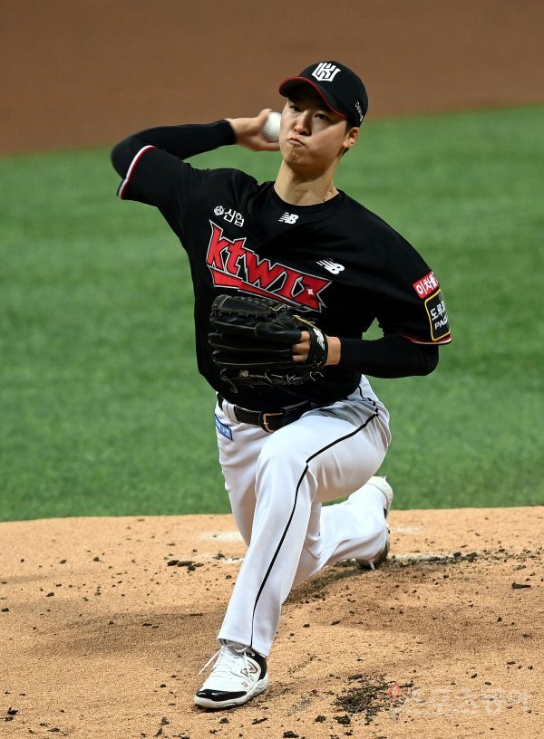 16일 서울 고척스카이돔에서 ‘2022 신한은행 SOL KBO리그’ 키움 히어로즈와 kt 위즈의 준PO 1차전 경기가 열렸다. kt 선발투수 엄상백이 힘차게 볼을 던지고 있다.