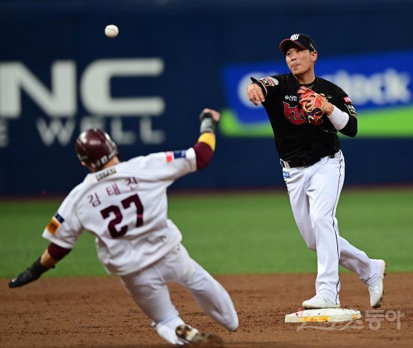 16일 서울 고척스카이돔에서 열린 ‘2022 신한은행 SOL KBO리그’ 준 플레이오프 1차전 키움 히어로즈와 KT 위즈의 경기에서 2회말 무사 1, 3루 키움의 내야 땅볼 때 KT 박경수가 1루주자를 포스 아웃시킨 후 1루로 송구하고 있다.