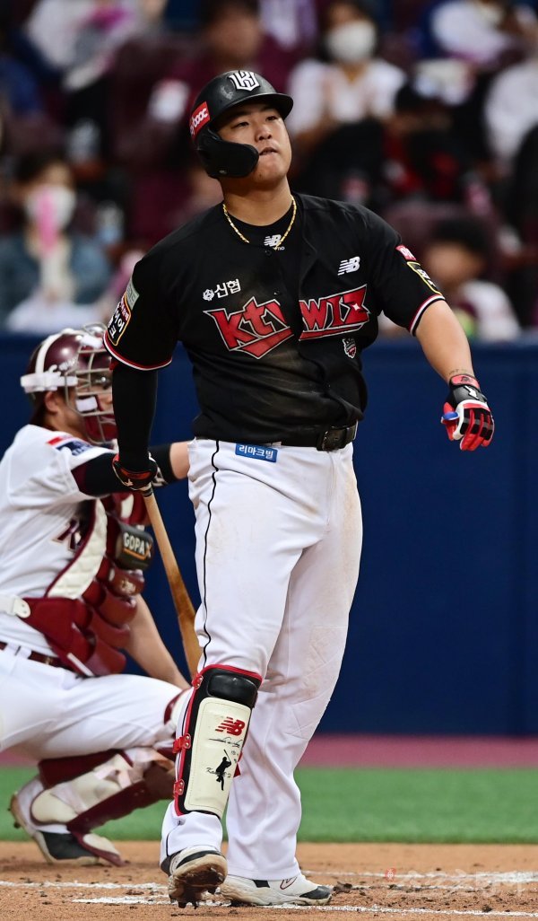 16일 서울 고척스카이돔에서 열린 ‘2022 신한은행 SOL KBO리그’ 준 플레이오프 1차전 키움 히어로즈와 KT 위즈의 경기에서 2회초 1사 KT 강백호가 헛스윙 삼진 아웃을 당한 후 아쉬워하고 있다.