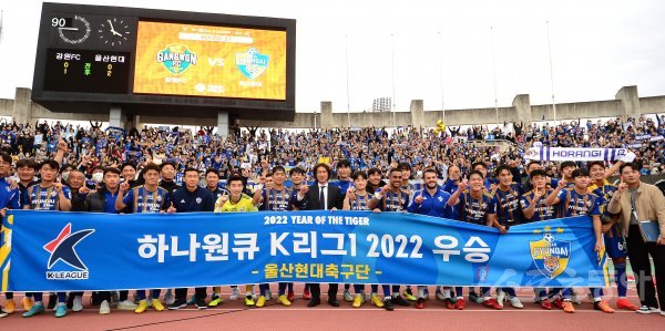 16일 춘천송암스포츠타운에서 열린 프로축구 ‘하나원큐 K리그1 2022’ 강원FC와 울산현대 경기에서 2-1 역전승을 거두며 우승을 확정지은 후 울산 선수들과 기념촬영을 하고 있다.