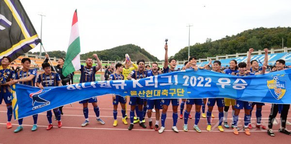 16일 춘천송암스포츠타운에서 열린 프로축구 ‘하나원큐 K리그1 2022’ 강원FC와 울산현대 경기에서 2-1 역전승을 거두며 우승을 확정지은 후 울산 선수들이 기념촬영을 하고 있다.