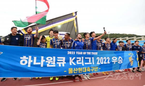 16일 춘천송암스포츠타운에서 열린 프로축구 ‘하나원큐 K리그1 2022’ 강원FC와 울산현대 경기에서 2-1 역전승을 거두며 우승을 확정지은 후 울산 선수들이 기념촬영을 하고 있다.
