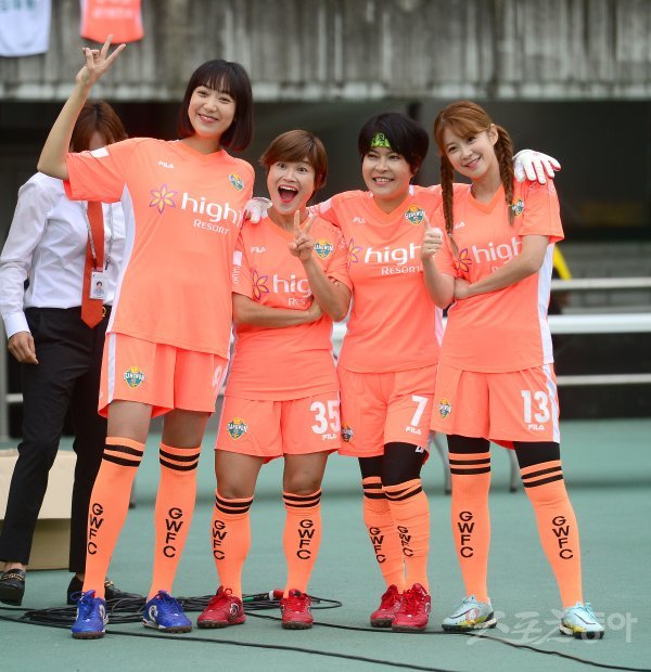 16일 춘천송암스포츠타운에서 열린 프로축구 ‘하나원큐 K리그1 2022’ 강원FC와 울산현대 경기에서 ‘골 때리는 그녀들’의 FC개벤져스 이은형, 김혜선, 조혜련, 김승헤가 포즈를 취하고 있다.