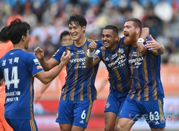 16일 춘천송암스포츠타운에서 열린 프로축구 ‘하나원큐 K리그1 2022’ 강원FC와 울산현대 경기에서 울산 마틴 아담(63번)이 역전골을 성공시킨 후 동료들과 기뻐하고 있다.