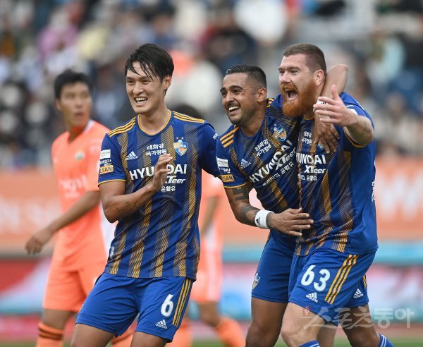 16일 춘천송암스포츠타운에서 열린 프로축구 ‘하나원큐 K리그1 2022’ 강원FC와 울산현대 경기에서 울산 마틴 아담(63번)이 역전골을 성공시킨 후 박용우, 레오나르도와 기뻐하고 있다.