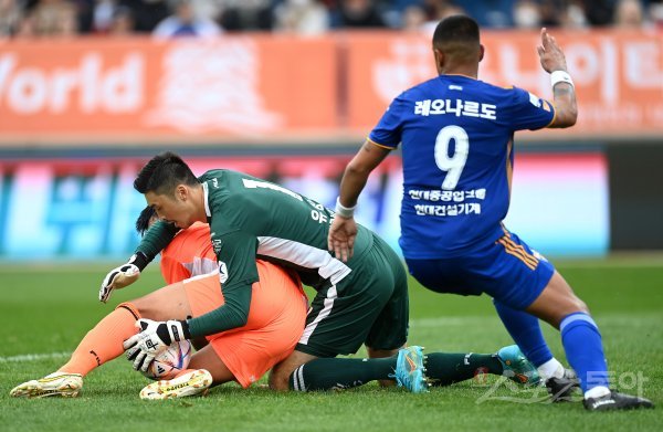 16일 춘천송암스포츠타운에서 열린 프로축구 ‘하나원큐 K리그1 2022’ 강원FC와 울산현대 경기에서 강원 유상훈이 울산의 슛팅에 앞서 볼을 잡고 있다.