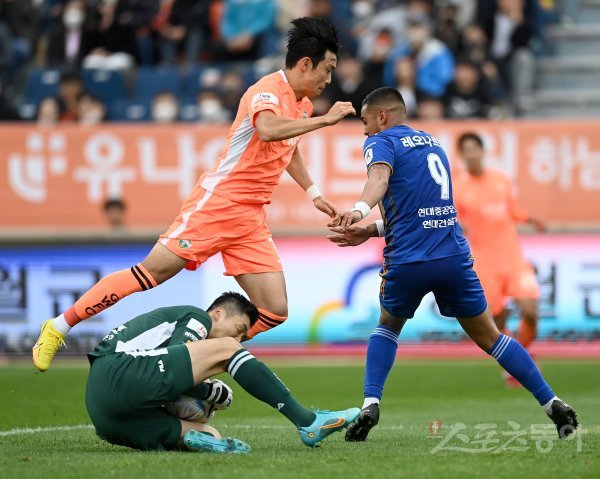 16일 춘천송암스포츠타운에서 열린 프로축구 ‘하나원큐 K리그1 2022’ 강원FC와 울산현대 경기에서 강원 유상훈이 울산 레오나르도의 슛팅에 앞서 볼을 잡고 있다.