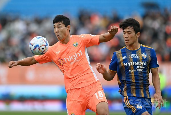16일 춘천송암스포츠타운에서 열린 프로축구 ‘하나원큐 K리그1 2022’ 강원FC와 울산현대 경기에서 강원 이정협이 울산 김기희 수비를 뚫고 공격하고 있다.