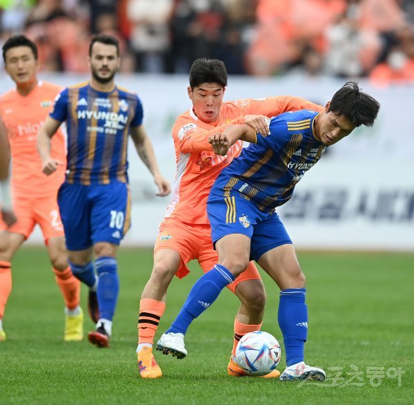 16일 춘천송암스포츠타운에서 열린 프로축구 ‘하나원큐 K리그1 2022’ 강원FC와 울산현대 경기에서 강원 황문기와 울산 박용우가 볼다툼을 하고 있다.