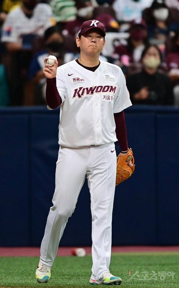 16일 서울 고척스카이돔에서 열린 ‘2022 신한은행 SOL KBO리그’ 준 플레이오프 1차전 키움 히어로즈와 KT 위즈의 경기에서 8회초 2사 1, 2루 KT에 동점 1타점 우전 적시타를 허용한 키움 양현이 아쉬워하고 있다.