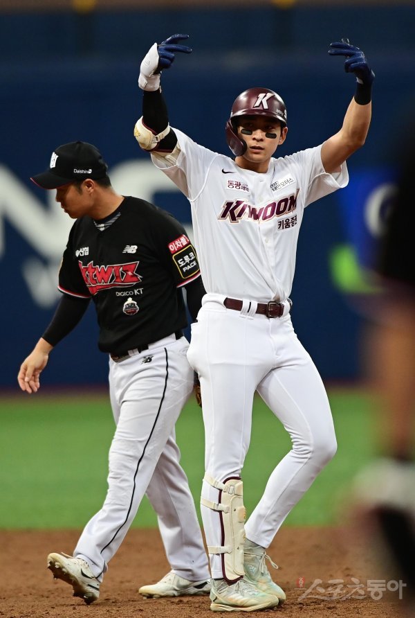 16일 서울 고척스카이돔에서 열린 ‘2022 신한은행 SOL KBO리그’ 준 플레이오프 1차전 키움 히어로즈와 KT 위즈의 경기에서 7회말 1사 키움 이정후가 좌전 2루타를 친 후 더그아웃을 향해 세리머니하고 있다.