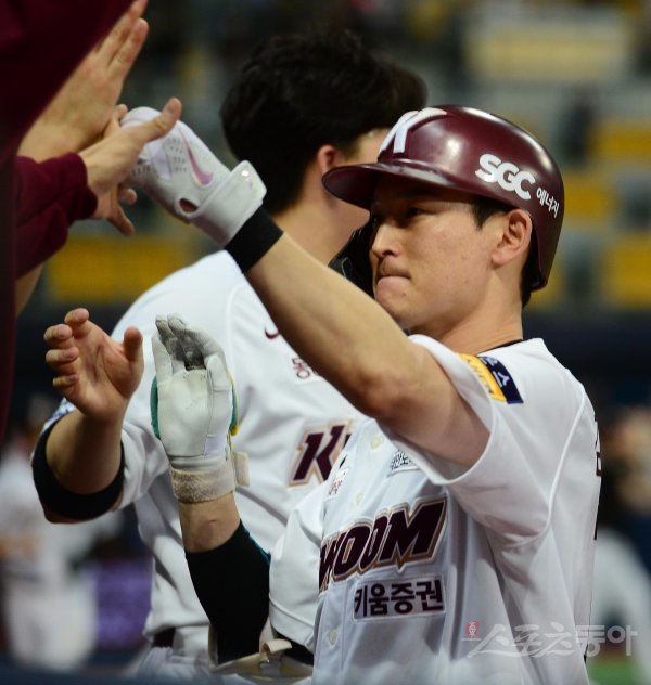 16일 서울 고척스카이돔에서 열린 ‘2022 신한은행 SOL KBO리그’ 준 플레이오프 1차전 키움 히어로즈와 KT 위즈의 경기에서 8회말 1사 1, 3루 키움 김준완이 1타점을 올리는 희생 플라이를 친 후 더그아웃 앞에서 동료들과 기쁨을 나누고 있다.