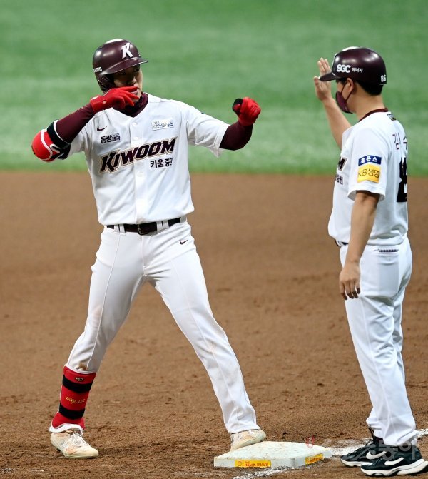 16일 서울 고척스카이돔에서 ‘2022 신한은행 SOL KBO리그’ 키움 히어로즈와 kt 위즈의 준PO 1차전 경기가 열렸다. 8회말 1사 1, 2루에서 키움 송성문이 1타점 적시타를 날린 후 환호하고 있다.