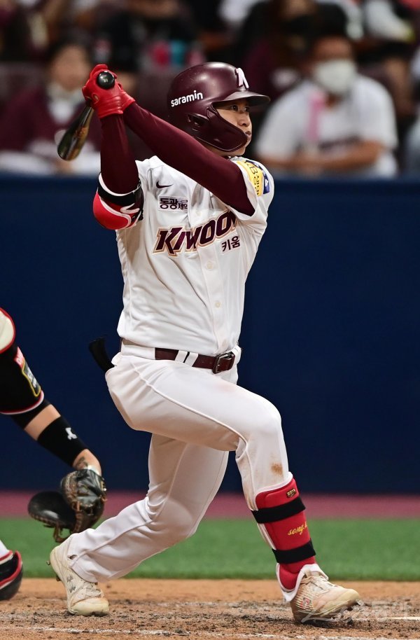16일 서울 고척스카이돔에서 열린 ‘2022 신한은행 SOL KBO리그’ 준 플레이오프 1차전 키움 히어로즈와 KT 위즈의 경기에서 8회말 1사 1, 2루 키움 송성문이 1타점 좌전 적시타를 치고 있다.
