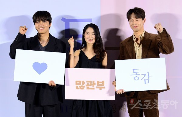17일 서울 용산구 CGV 용산아이파크몰에서 열린 영화 ‘동감’ 제작보고회에서 여진구, 김혜윤, 배인혁이 포즈를 취하고 있다.