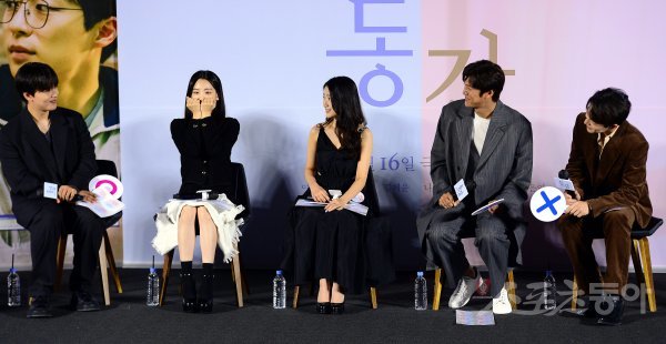 17일 서울 용산구 CGV 용산아이파크몰에서 열린 영화 ‘동감’ 제작보고회에서 조이현의 애교 포즈를 배우들이 지켜보고 있다.