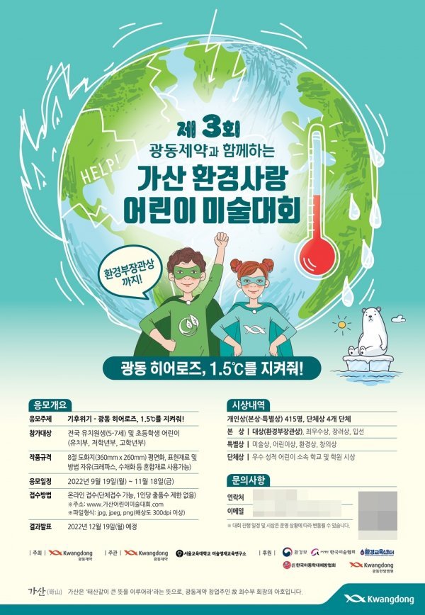 ‘기후위기- 광동 히어로즈, 1.5℃를 지켜줘!’라는 주제로 기후 위기를 극복하기 위한 나만의 실천방법이나 기후위기가 없는 미래를 상상하여 그림으로 표현하면 된다. 5~7세 유치원생과 초등학생이면 개인 및 단체 단위로 응모할 수 있다. 주제에 맞는 작품을 8절지에 맞춰 창작 후 작품을 촬영한 사진을 ‘온라인 응모 페이지에 제출하면 된다. 접수는 11월18일까지며 심사 결과는 12월 발표한다. 환경부장관상에 해당하는 대상을 포함해 개인 415명, 단체 4곳을 선정해 시상한다.
